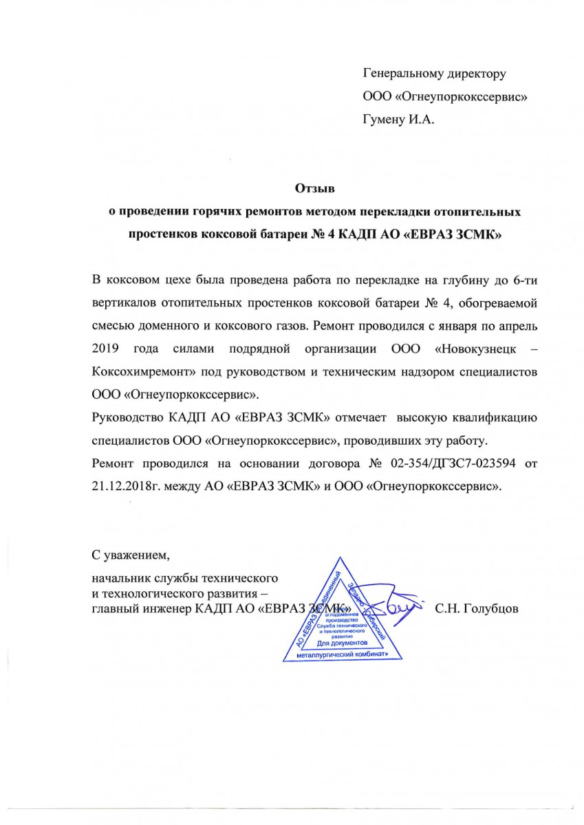 30 апреля 2019 года закончен ремонт отопительных простенков коксовой батареи № 4 коксового цеха АО «ЕВРАЗ ЗСМК», г. Новокузнецк. За период с 15.01.2019 по 30.04.2019 при техническом содействии специалистов ОКОС выполнена их перекладка на глубину от 4-х до 6-ти вертикалов. Коксовая батарея № 4 обогревается смесью доменного и коксового газов. Ремонт проводился с полным отключением от обогрева простенков с ремонтируемой стороны. Помимо этого были выданы рекомендации по дальнейшему проведению ремонтов и ведению технологического режима обогрева коксовой батареи.
